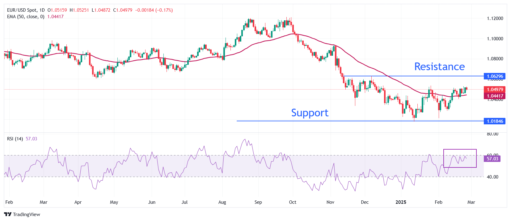 EUR/USD stays in a tight range at around 1.0500 on Wednesday. The 50-day Exponential Moving Average (EMA) continues to support the major currency pair around 1.0440.