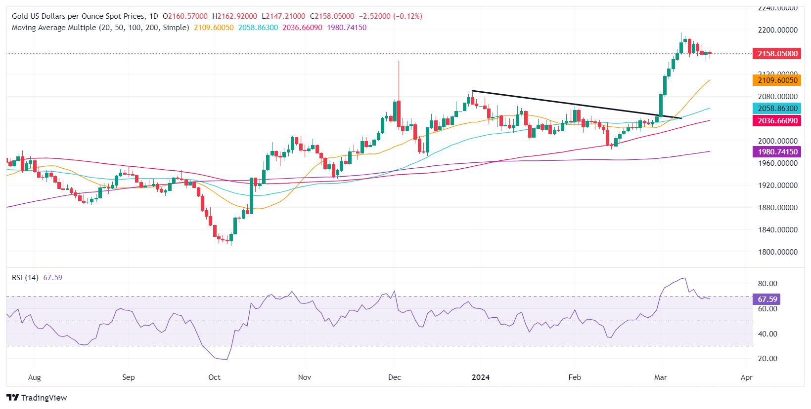 XAU/USD price has stabilized ahead of the FOMC decision, sitting above the December 4 high of $2,146.79, the first support level. A dovish tilt by the Fed could pave the way for a recovery toward the March 8 high of $2,195.15, followed by the $2,200 mark.